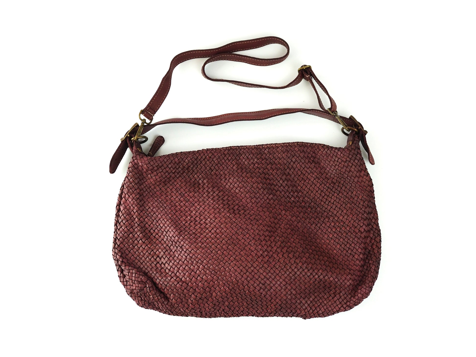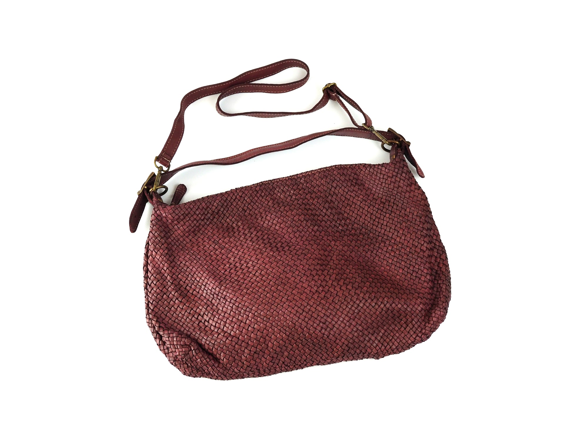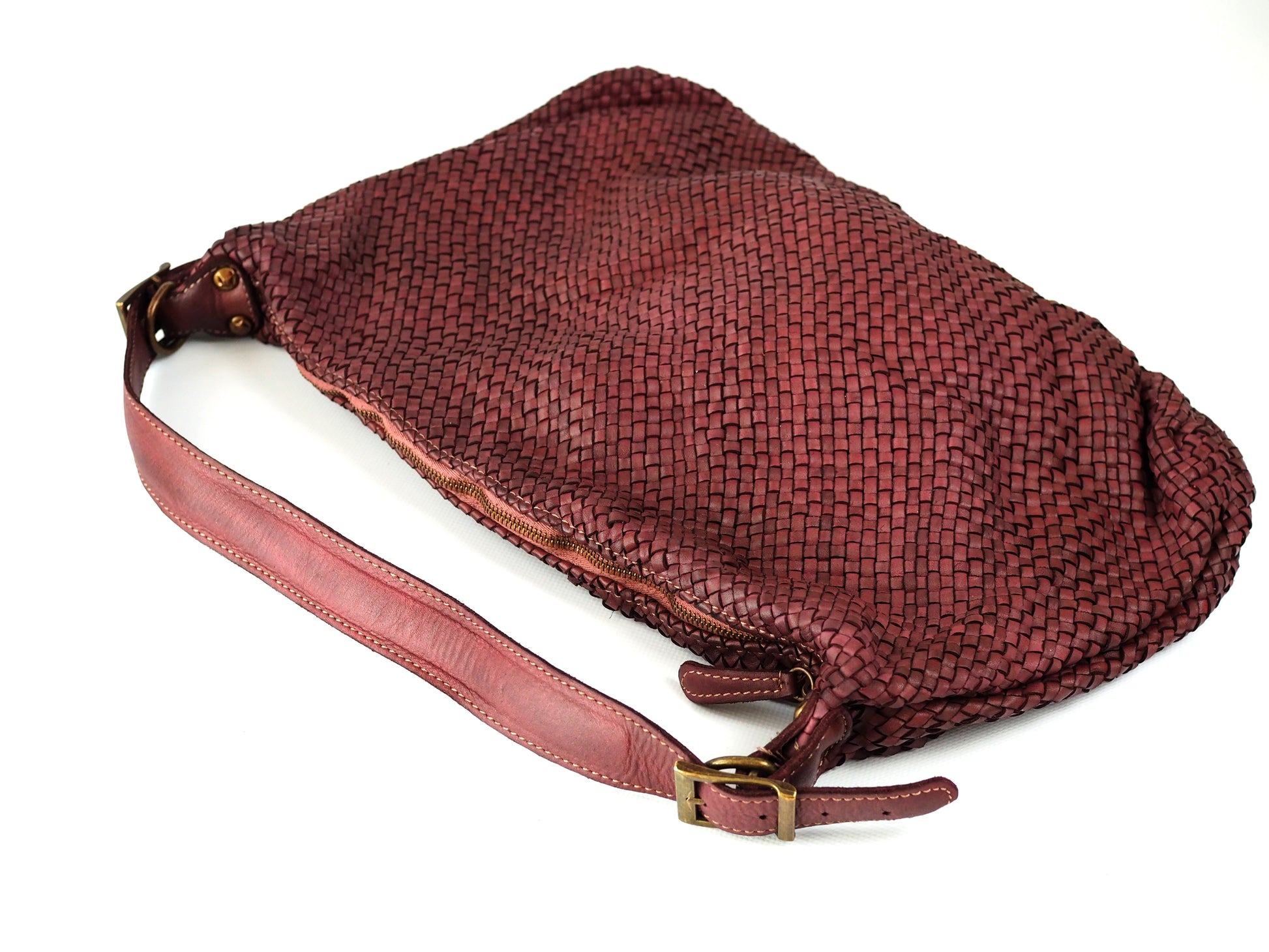 Die große Tasche Brunello aus rotweinfarbenem, geflochtenem Echtleder ist ein echter Blickfang mit edler Ausstrahlung. Das Hauptfach bietet viel Platz und verfügt über ein zusätzliches Innenfach für kleinere Essentials. Ein Reißverschluss sorgt für sicheren Verschluss, der verstellbare Umhängeriemen garantiert optimalen Tragekomfort.